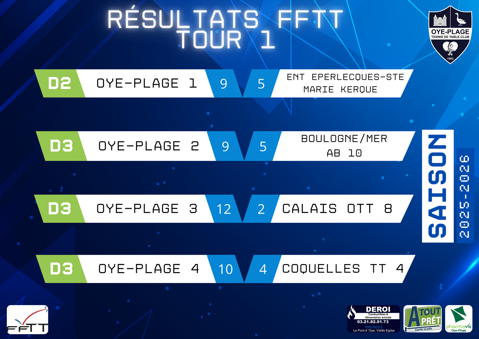 Nos équipes d’Oye-Plage Tennis de Table ont parfaitement lancé leur saison FFTT avec de belles victoires lors de ce premier tour 💪